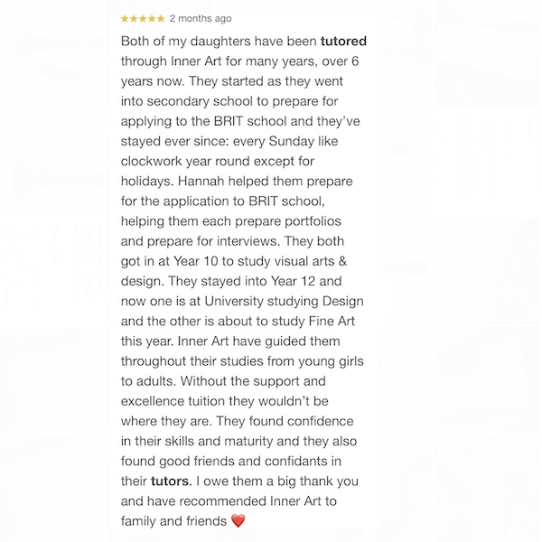 With so many special successes, including double Art scholarships, Brit School places, artwork accepted for Royal Academy Summer Exhibition & Young Artists, A level & GCSE results, Art competition entries, Art portfolios and many more, there's many reasons to celebrate. But ultimately students' belief in themselves is priority, and sometimes just gaining the confidence to share artwork with a friend is an achievement in itself. The journey is the reward.